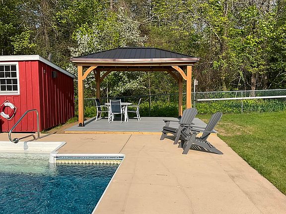 Beautifully and meticulously cared for 2 bedroom, 2 bath cape with saltwater pool and detached barn that sits perfectly on a 1-acre lot. This home has been lovingly cared for and occupied by the original owners, who built the property in 1979 and has had many upgrades, including kitchen and bathroom remodels, new flooring, new windows in nearly every room and the addition of a Farmer's porch. The home is warm and inviting, flooded with lots of natural light. The main floor includes a well-appointed, eat-in kitchen, dining room, living room with pellet stove, 3/4 bath, den and laundry area. The second floor offers two nicely sized bedrooms and a shared full bath. The walk-out, lower level is partially finished and includes a spacious family room with sliding door to the backyard, office space and additional storage space. Need extra garage space? Not a problem. There is both an attached 2-car garage and a detached barn. The barn has an additional garage bay, tall ceilings and an abundance of storage space, as well as heated office space on the second floor. The lot is lovely, private and completely fenced. You will feel like you are on vacation at this property with the in-ground, saltwater pool, newly added covered gazebo, pool house and greenhouse. The backyard gets lovely sunshine and there are many places to garden. Delayed showings begin Saturday, 2/10 at open house from 11-1.