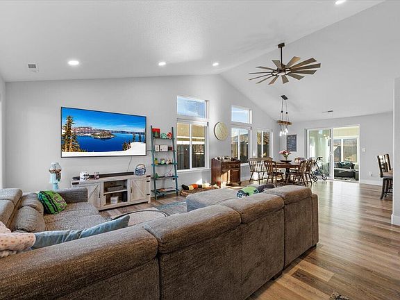 Stunning Modern Remodel in a Sought-After Neighborhood! This beautifully updated home features fresh vinyl flooring throughout, plush carpet in the bedrooms, fresh interior paint, stylish new lighting, and updated window treatments. The open floor plan boasts vaulted ceilings, a spacious living area, and ceiling fans for added comfort. A well-designed efficient kitchen, warm solid wood cabinetry, and upgraded appliances. Generous bedrooms offer ample closet space. Step outside to a sprawling backyard with a dyed concrete patio, gazebo, chicken coop, and storage shed—all framed by breathtaking panoramic mountain views. Additional perks include a pull-down attic ladder for easy storage access and RV Parking. Bonus: The sunroom provides extra space (not included in square footage). Don't miss this exceptional opportunity!