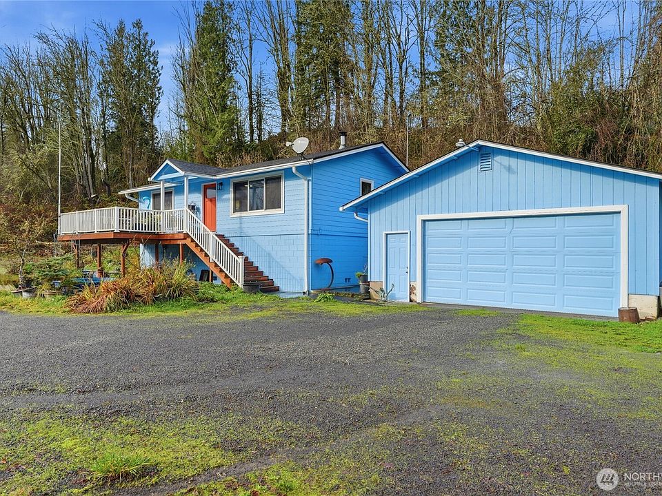 Unique country living - 1 story home on elevated foundation. 1008 SqFt w/open-concept, thoughtfully designed 2 beds, 1 bath home sits on 2 acres. Layout is inviting w/ bamboo flooring, wood stove, & natural light throughout. Bedrooms are spacious. Ext Fiber Cement Siding, New Roof (2024), Ext Paint (2024), and Composite Deck ideal for morning coffee or relaxing evenings. Detached garage - parking, storage, or workshop. New septic installed 2025. Elevated foundation provides exceptional access w/ 8-ft crawlspace. Most of acreage is level and great for gardening, animals, or future possibilities. Several varieties of apple & other fruit-producing trees, perfect for fresh pies, cider, or welcoming wildlife!