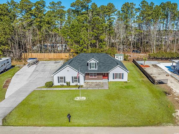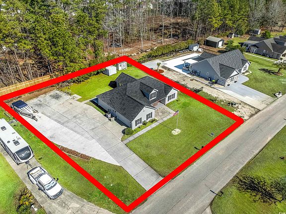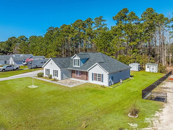 MODERN RANCH HOME on HALF-ACRE LOT with NO HOA zoned CFA for a multitude of uses including some commercial. Plenty of poured concrete parking area for boats, motor homes, and trailers, (NO RESTRICTIONS). Inside is open and bright with high cathedral ceilings, large dormer window, and a Carolina Room. The spacious kitchen has a breakfast bar, lots of counter space, and stainless steel appliances. The split bedroom plan offers some privacy from the owners’ suite which is equipped with a walk-in shower and spacious walk-in closet. You will have the convenience of cabinets in the side load garage, as well as the laundry room. The back yard is spacious with a poured patio and a detached storage shed. At the rear of the driveway is a poured foundation from what was a 3-car garage with living space above. This can readily be re-built. Having no HOA and Commercial Forest Agricultural zoning this property is very flexible regarding allowable uses.