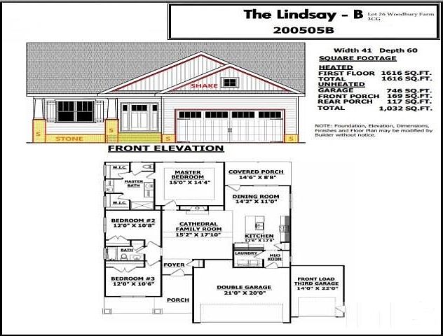 The Lyndsey B features 1616 square feet with 3 bedrooms, 2 full baths and a 3 car garage. Open concept family room, kitchen and dining room. Cathedral ceilings in the family room and master has his and her walk in closets and vanities. Front and back porch is a great place to entertain family and friends. Close to Sanford and a short commute to Lillington, Fuquay-Varina, Cary or Ft. Bragg.