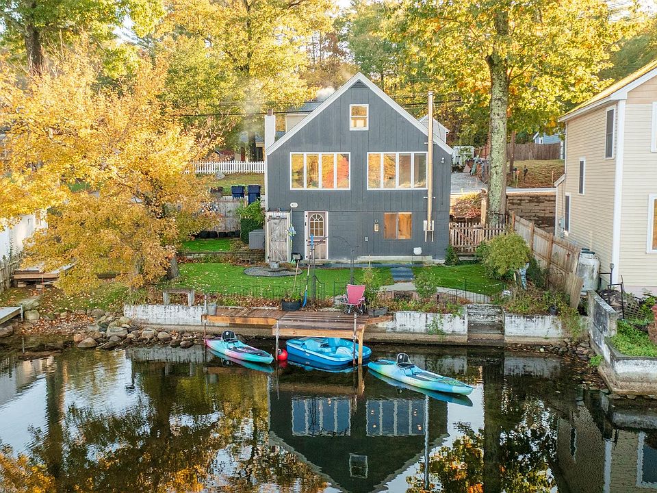Kick back & relax in your staycation home directly on the water. This amazing home has been updated in every way. 2+ Bed & 1+ Bath. Enter through the front door & into the hallway with a bedroom on the left & a full bath on the right. You move down the short hall to the open kitchen that unfolds into a dining area & adjacent living room. A mix of engineered & hardwood floors distinguish the kitchen from the living area looking onto the lake & back courtyard. A stairway on the South wall of the living room ascends to an upper floor with a bedroom and balcony that looks down upon the living area. A second stairway off the kitchen descends to the lower floor. At the bottom of the stairs is a bedroom to the left & to the right a cozy family room area with a wood-burning stove. In addition, the lower floor contains your laundry area. A door on the west wall of the lower level opens directly onto the courtyard & the permanent dock on the lake. Have your morning coffee, step out your back door and take a morning plunge. It’s a great place to come home to, with a two-car driveway, additional parking spaces off the road in front of the house. Walk out to the astroturfed courtyard provide a shaded ambiance for daily decompression or hosting family and friends. It’s only a 5-minute walk to Silver Lake State Park or the Hollis State Forest. Barbeque, swim, fish, canoe, kayak. Trails for hikers, equestrians & dog people