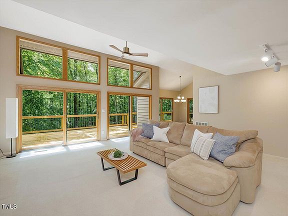 Looking for the feel, privacy, and views of a mountain house yet desire living close to everything you need? This is the house for you! Situated at the end of a large culdesac in the highly desirable Lochmere neighborhood in Cary, this one checks all the boxes. The foyer and family room welcome you with a wall of windows overlooking a half acre of beauty and privacy. The spacious kitchen provides lots of counter and cabinet space with flow to the dining area and out to the screened in porch with EZ Breeze windows. The deck and lower patio allow you to become one with nature. The super sized family room is perfect for large gatherings and accented with a stacked stone fireplace. The first floor includes an office. laundry, and primary bedroom suite with access to the expansive deck. Upstairs you'll find two large bedrooms with amazing closet space, loft area, and a beautifully updated bathroom. The basement provides another large entertaining space complete with fireplace, bedroom with WIC, rec room area, updated bathroom, and kitchen plus great walk in storage. Walk the trails down to the creek or down to the neighborhood pools, tennis courts, playground, and boat ramp. Fantastic house and neighborhood close to Waverly Place and Lochmere Pavilion shopping, Koka Booth Amphitheater, US1/40 and everything that makes Cary the #1 place to live!