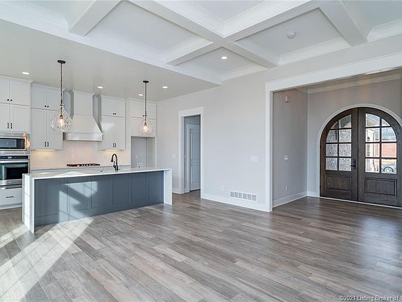 The JAMES 3 CAR GARAGE Floor plan was exclusively designed for THE MANORS ESTATES OF OLD SALEM. Ideally located, just three minutes from the NEW EAST END BRIDGE, this home sits on a large lot with SCENIC VIEWS and offers ELEGANCE at every turn. When you enter this 4 bedroom, 3 bath English Cottage style home, the 11 FOOT COFFERED CEILINGS, oversized windows, GAS FIREPLACE and OPEN FLOOR PLAN take your breath away. The chef's kitchen features a LARGE CUSTOM PANTRY, 10ft cabinets with custom LIGHTING and Ceiling DETAIL, QUARTZ WATERFALL counter tops, FARMHOUSE SINK, stainless appliances, and OVERSIZED ISLAND. The luxury continues in the master suite, with BARREL CEILINGS, large FREE STANDING TUB, custom glass shower, dual granite vanities, and HUGE WALK-IN CLOSET. The split floor plan also provides a large laundry room, full bath and two other bedrooms on main level. The WALKOUT BASEMENT offers 9-FOOT CEILINGS, a spacious family room, 4th bedroom, full bath and provides plenty of storage w/ UTILITY GARAGE! Homeowners will also enjoy their home's own personal IRRIGATION SYSTEM and FIBER OPTIC CABLE, providing the Fastest Internet available in the region! Call today to schedule your private showing! Estimated Completion: April/2021