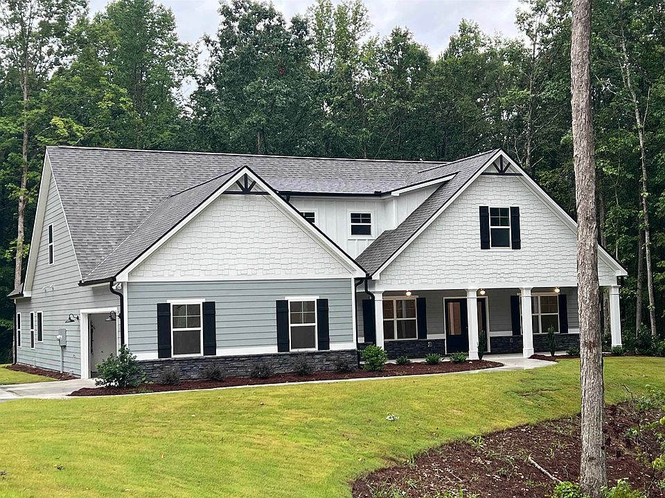 Benson B XL - 5 Bedrooms, 3 Baths - a ranch plan with an open concept! Walking into the Foyer allows a view of the dining room, family room, kitchen, and breakfast area. The Dining Room features chair railing and coffered ceiling. The Family Room has a row of windows overlooking the backyard and a beautiful fireplace. The Kitchen will feature stainless steel appliances and a stainless steel vent hood, and a large island with upgraded marble countertops. The Master Bedroom has tray ceilings and is connected to the ensuite with double vanities, garden tub, separate shower, and walk-in closet. Also on the main level are two secondary bedrooms and a full bath with double vanities. Large mudroom off of the garage and separate laundry area. Upstairs there is a bonus area, two more secondary bedrooms, and a full bath with double vanities. Off the breakfast area, doors open to the expanded covered patio, with additional uncovered patio to overlook private, wooded backyard.