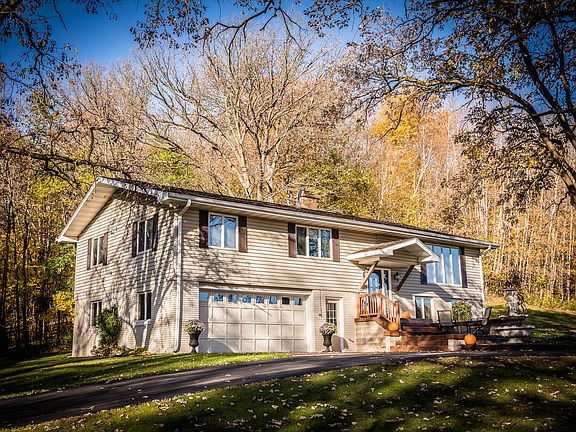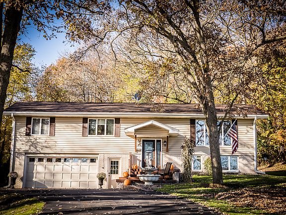 Close to town and only 2 miles to school boasting 10.3 wooded acres of wildlife this home is your place to unwind on weekends and let your children roam. Beautiful stamped concrete entry and paved circle driveway leads to your insulated and heated 28X40 shed, with storage above. Home offers a full finished basement with wood burning fireplace and bathroom. Upstairs you will enjoy a living room area with adjacent open kitchen and dining space. Dedicated laundry area off the kitchen is convenient for families. The backyard deck off the kitchen is a great area for grilling while you watch the kids play out back. 3 bedrooms and 2 bathrooms complete the upper level. The attached garage will keep you warm and dry all winter. Home features a private well-with amazing water quality and private conventional sewer system. This home is structurally sound, solid and cared for. We are the second owners and have lived here since 1996.