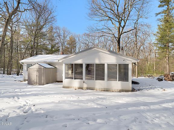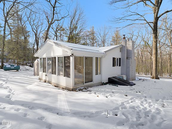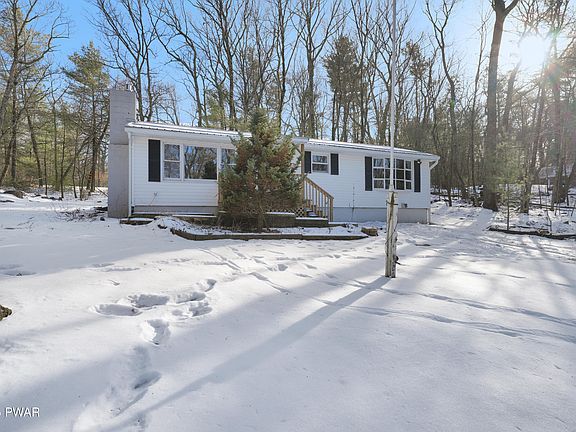 GREAT DEAL AT ONLY $149,900! FANTASTIC OPPORTUNITY FOR YOUR PERSONAL ESCAPE TO THE POCONO REGION OR BECOME A LANDLORD OR FIX AND FLIP! Cozy 3-bedroom, 1-bathroom home with 840 sq. ft. of living space. Features wood paneling, large windows, and a fireplace. Surrounded by picturesque wooded views, perfect for nature lovers. This charming single-story home interior is characterized by a blend of rustic and modern elements. Wood paneling features prominently in several rooms, adding warmth and character. Large windows, particularly in the living area, flood the space with natural light and offer stunning views of the surrounding wooded landscape. The home boasts new beautiful laminate flooring, most of which is new. The kitchen is equipped with stunning knotty pine wooden cabinetry and a convenient gas range. A standout feature is the stone fireplace in the living room, perfect for cozy evenings. The primary bedroom measures 135 sq. ft. and, like other rooms, benefits from baseboard heating. The dining room, which could also serve as a third bedroom, features a new wood accent wall and brand new laminate flooring. The property also includes a three season room which also includes the laundry hookup. Despite its compact size, the layout feels open and functional, with a combined kitchen and living room area. The wooded setting provides a sense of privacy and connection to nature, making this home a potential retreat for those seeking a tranquil living environment. Prime location just outside of beautiful Milford Area. Located in the non-gated area of the community which offers members multiple lakes, an outdoor swimming pool, and other amazing amenities. Schedule your showing today! This property will not last!!!