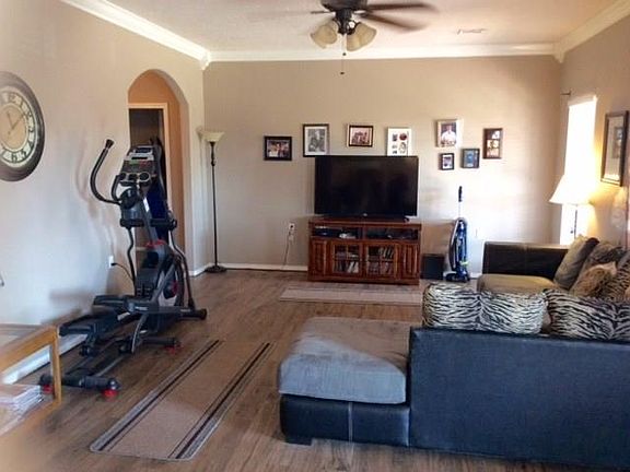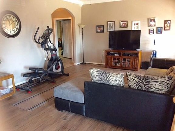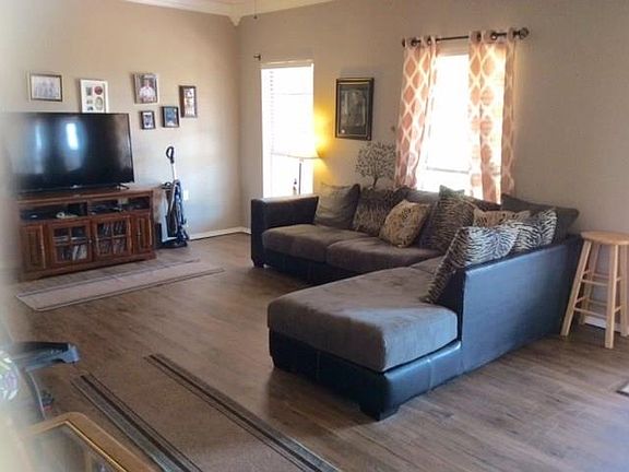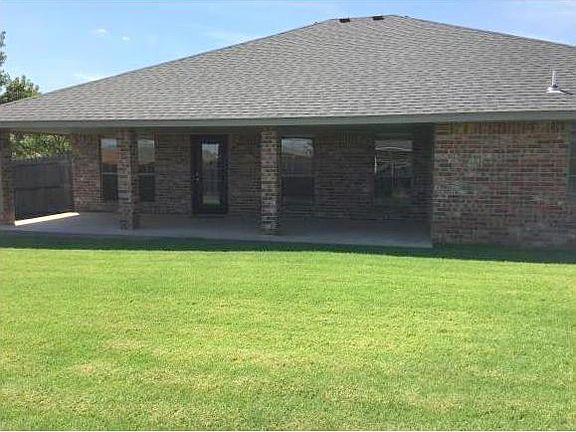 Beautiful home on large corner lot. Brick and stone exterior design with covered front entry and large covered back patio. 3 bedroom, 2 full bath, open kitchen, dining and living room floor plan. Kitchen offers tall breakfast eating bar and plenty of cabinet and counter space. Tiled flooring in kitchen, entry, baths and utility, vinyl wood like flooring in living room and carpeting in bedrooms. Large master bedroom with huge master bath, offering a double vanity, 2 walkin closets, large oval garden tub and separate walkin shower. Full guest bathroom with tub shower and inside utility room. 3rd bedroom is off front entry and could be office space if needed. Huge back yard with large covered patio, wood privacy fence and sprinkler system. Must see to appreciate...