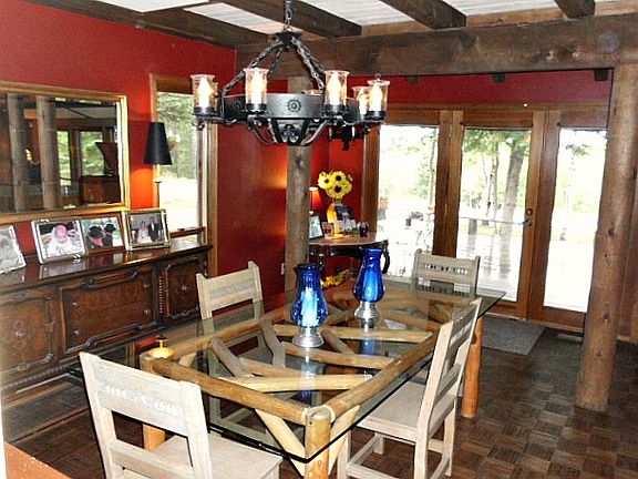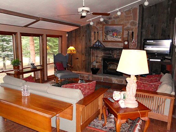 Lovely stucco home close to golf course and country club. Two combined lots with gorgeous views of northern mountains. Open living space, comfortable and cozy. Beautiful yard with large Aspen and fir trees with fenced dog pen in back. Back-up Onan generator, jetted- tub, nice wood flooring and carpet in master, new range and oven, alarm, dishwasher and microwave as of 2008. Three large bedrooms plus large loft and 2.5 bath also nice storage room upstairs off bath with window with views(could be made into an office). Nice large circle drive with very easy home access.