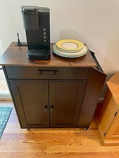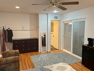Spacious master bedroom/bathroom with private entrance in single-story, detached Village Park home. Newly renovated with a sliding glass door, laminate wood and tile flooring, fresh paint, and a ceiling fan. It has a queen bed, dresser, side tables, large dresser, small refrigerator/freezer, kitchen cart, and smart TV. Minimum 30-day rental, month-to-month. $800 refundable deposit + $100 nonrefundable cleaning fee + first month rent to move in. No additional utility costs. No smoking is allowed inside.