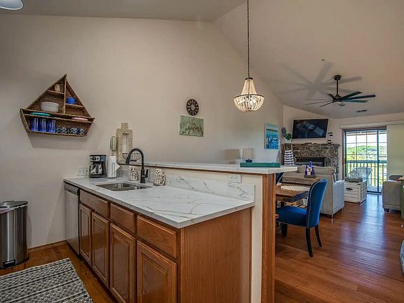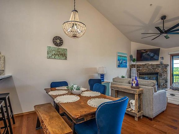 Vibrant view! Welcome to this rustic retreat with modern comforts and stunning views of Table Rock Lake. This penthouse condo features numerous upgrades, including stainless steel appliances, quartz countertops, and luxurious furnishings included in price. The bedrooms are outfitted with plush King and Queen beds, fresh carpeting, and smart TVs, while the spacious living area boasts stylish furniture, a queen sleeper sofa, and smart TV. Both bathrooms shine with new sinks, faucets, and a relaxing jacuzzi in the primary bath. Enjoy the warmth of the wood-burning fireplace, the beauty of hardwood cedar floors, and serene lake views. Step outside to a well-furnished deck with a swing, patio tables, and a Ninja electric grill. Village At India Point amenities include indoor and outdoor swimming pools, a hot tub, sauna, clubhouse, fitness center, walking trails, lake access, and more. Located in Branson near Indian Point Marina and Silver Dollar City, this lake view penthouse is ideal for vacations, rental investment, or year-round living in the Ozarks.