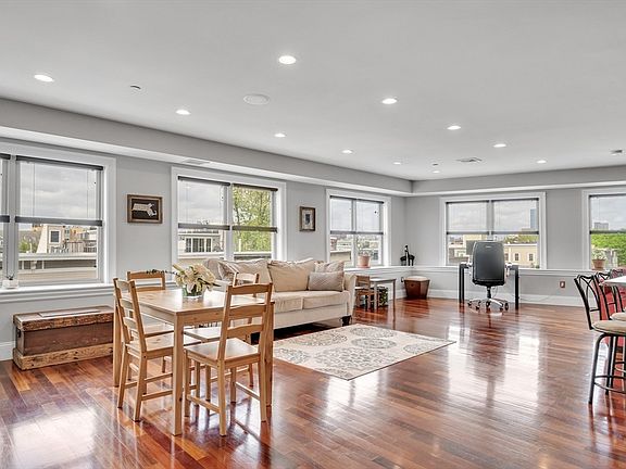 Welcome home to this expansive home at 120 W 7th St. #402 in the exciting West Side neighborhood of South Boston. With over 1600 square feet of living space this corner unit has sweeping views of the Boston skyline. This sun-drenched home has three exposures over 10 massive double windows, allowing for an abundance of natural light. The master suite is expansive and features multiple closets including an oversized walk-in as well as a spacious en-suite bathroom. The second bedroom is also king-sized currently able to accommodate a bedroom, playroom and office all in one. Third space/den area with TV could easily be the 3rd bedroom. With Brazilian hardwoods throughout, granite counters, SS appliances, surround sound & 1 deeded garage parking spot as well as an incredible 2,500 square foot common roof deck with two gas grills and amazing views of Boston. Just steps from the Broadway T stop, restaurants, retail, coffee shops, parks, and more!