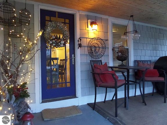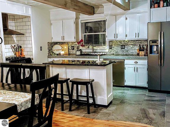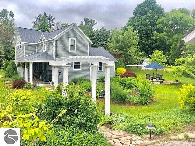 Charming restored Village Farmhouse, complete with a roomy covered front porch surrounded by cedar shake siding. Enter through a custom glass Pella front door into a great room dining and kitchen. A Chef's delight with granite island, farm sink, gas range with hood vent under whitewashed open beam ceilings. Snuggle down in the light and bright living room with it's cozy gas log fireplace. Renovated with Pella windows, siding & roof in 2003, electrical panel 2006, an efficient geothermal heat pump, well pump & pressure tank in 2019. Subway tile accents in kitchen and baths. You'll love the convenient walk of Village life with stores, post office, churches, dining, pubs and local Curling Leagues. the large corner lot is landscaped with stone walk, secret garden patio area surrounded by gorgeous perennials. The 1+ car garage has a new electric door, attic storage and has a lean-to behind it with room for 2 more vehicles. With the County Road Commission in town the roads get cleared promptly in the winter.