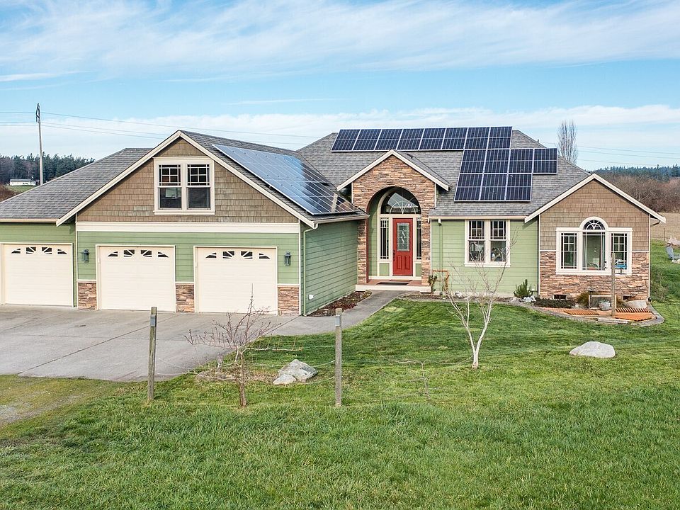 Set on 4.92 acres of open, lush greenery, this property offers the serenity of country living just minutes from the city. Step through the grand entryway to be greeted by soaring ceilings and wall to wall windows that fill the home with natural light. The oversized living room flows seamlessly into the stunning kitchen, featuring expansive granite countertops, stainless steel appliances, and a generous center island. An adjacent informal dining area is beautifully framed by bay windows. The spacious primary suite includes a relaxing jetted tub and a large walk-in closet. Above the garage, a finished bonus room provides the perfect space for a home office, studio, or hobbies. Outside, two separate patios invite you to relax and enjoy your private retreat. Additional upgrades include a wired natural gas generator, a heat pump, in addition to a natural gas furnace, for year-round comfort, and solar panels that keep electric costs nearly zero. A rare opportunity to enjoy space, privacy, and convenience in one exceptional property.