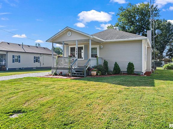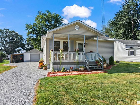 This two-bedroom bungalow in Thayer has been well-maintained and nicely updated! Outside, you will find NEW siding, NEW exterior doors, NEW shutters, and NEW gravel in the driveway. Enjoy the darling front porch, which enters the living and dining rooms, offering NEW laminate floors, NEW blinds, NEW ceiling fans, arched doorways, and replacement windows. The kitchen features NEW counters, a NEW sink, a stainless refrigerator, a stainless microwave, and a stainless range/oven. A large primary bedroom provides a walk-in closet, and a second bedroom has two closets (one with washer and dryer hookups). The full bath offers built-in storage, a NEW shower surround, a NEW vanity, and a NEW toilet. There are also NEW lights, NEW blinds, NEW doors, and more throughout! The basement is freshly painted with washer and dryer hookups. The backyard is fenced with a patio, a garden area, and an apple tree. There is a small one-car garage plus a lean-to for extra storage. Thayer is a golf car friendly community. The water heater is approximately 4 years old. The roof is approximately 12 years old.