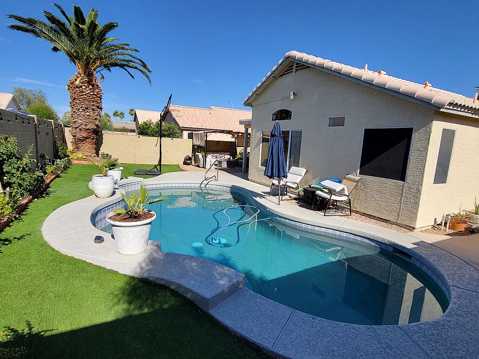 Fantastic 4 bedroom, 2 bath, 2 car garage with pool home for rent in Chandler, Az. Split floorplan with vaulted ceilings, updated kitchen with granite counters, rich cabinets, island w/ pendant lights open to a spacious family room. Low maintenance landscape out front. Beautiful back yard boasts new pool surface, plenty of patio deck & synthetic turf. Great location near shopping & restaurants.