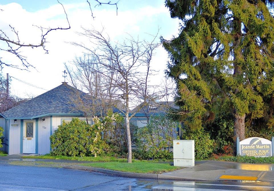 Commercial building with 4 offices, 2 bathrooms, 2 storage rooms, and an enclosed back patio with small concrete pond.