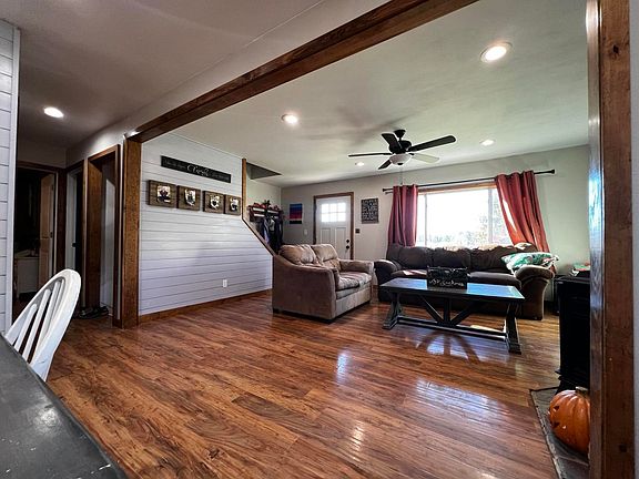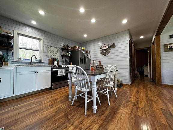 Maine country home for sale in Lowell, Maine. The first floor features an open concept kitchen/living room, a full bathroom and two bedrooms. The second floor has the primary bedroom as well as a 4th bedroom with a built-in playhouse. The partially finished basement has a large room and a second full bathroom. This home sits on 2.32+/- acres, there is a 100'x120' fenced in area with a three-stall barn with the potential of six stalls. Enjoy rural living here!
