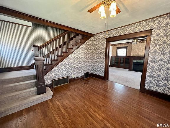 Own this grand historic 4 bed/1.5 ba home nestled on a large corner lot in Petersburg! Huge rooms, replacement windows, stunning hardwood floors, beautiful trim, pocket doors & prairie style finishes welcome you! Grand foyer houses custom stained glass front doors and wow staircase. Enormous Liv Rm boasts glass front custom bookcases and tiled front gas FP surrounded by custom stained windows, picture window overlooking the front porch & pocket doors that lead to the formal Dining Rm. Kit updated in the 90's w island, informal seating area & original butlers pantry! Main Flr bedroom or den w shared 1/2 ba. Upstairs boasts 3 large bedrooms ~ each with gorgeous hardwood flrs and plenty updated windows. Back bedrm has attached storage area that could be turned into master bath! Full basement has shower, and stoage galore! Outside offers great yard full of flower & rock gardens, a shed and a 2 car garage!