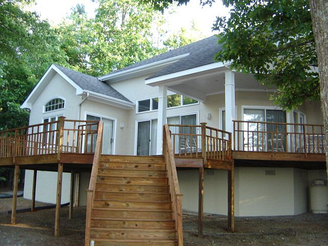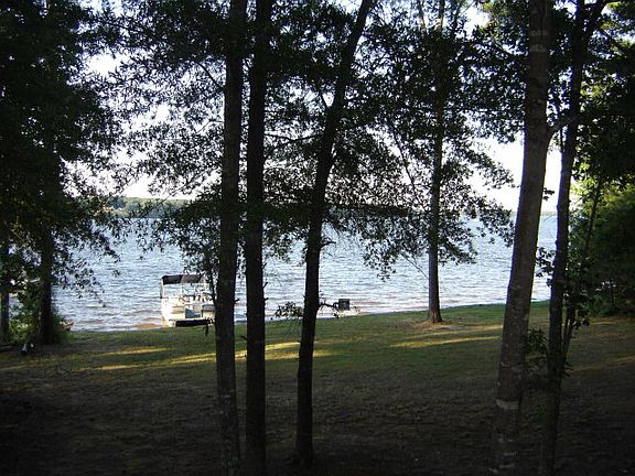 Beautiful views of the main lake abound from this waterfront home situated in an up-scale subidivsion on a level lot cleared to the waters edge. Enter through an open air courtyard with a view through the living area to the lake beyond. The living, dining and kitchen areas have tile flooring with a 3 sided gas fireplace as the focal point. Lighted custom bar in kitchen provides extra eating space and is adjacent to the living area which has lofty ceilings with recessed & accent lighting. Master suite consists of a large bedroom, double closets & bath with walk through shower, elevated tub and custom cabinets. 2 additional bedroom with private baths. Covered porch & deck plus 2 car garage.