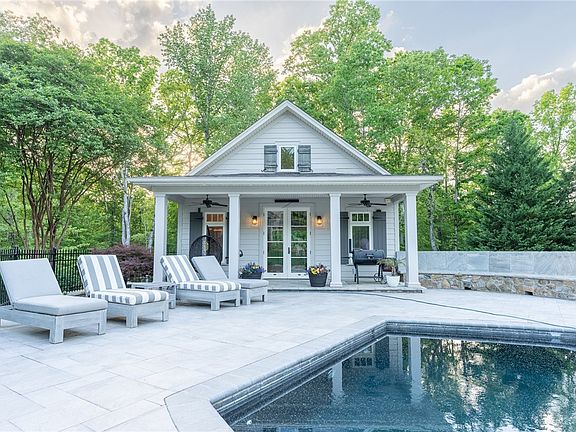 The guest cottage, perfect for entertaining, includes a bar, small oven, and ice machine, with a full bath conveniently located by the pool. Its loft is a delightful retreat for kids, and the unfinished basement offers ample storage space. Additionally, the property features an office/den with a cozy fireplace, a custom laundry room, a three-car garage, and a voluminous great room that truly feels like home.