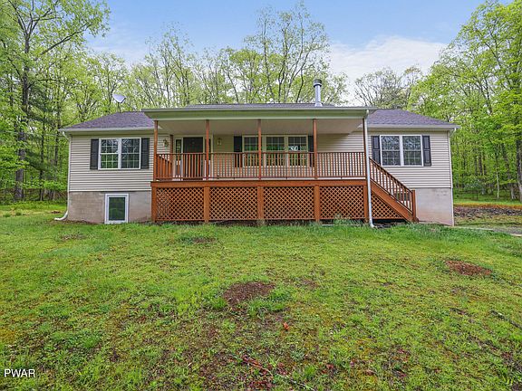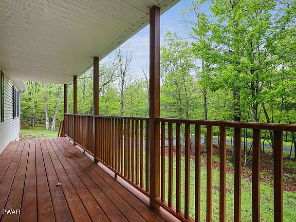 RANCH! Three ample sized bedrooms, all on the main floor and two full baths. Open floor plan, all stainless appliances. Luxurious primary bedroom with large ensuite. Stone front, wood-burning fireplace in the living room. Fully finished basement offers the second living room, 2 bonus rooms and the third full bathroom! Attached garage and plenty of parking spaces. There's full length covered front porch, 25' by 6', and a secluded back deck, 16' x 13', where you can sit and appreciate the natural scenery. Location is idyllic, property is just over an acre on a very quiet street. Tink Wig community has a 110-acre lake, perfect for fishing and non-motor boats. The community also has a private in-ground summer pool, a clubhouse, playground, and basketball courts. Plus, the inclusion of trash collection in the very low yearly dues, and PA has incredibly low taxes. Located in the Wallenpaupack Area School District, just 10 minutes to downtown Hawley for restaurants and shopping. Only 2 hours to NYC, less than an hour to NJ. It's a fantastic home, priced to sell fast, great for a family to enjoy!