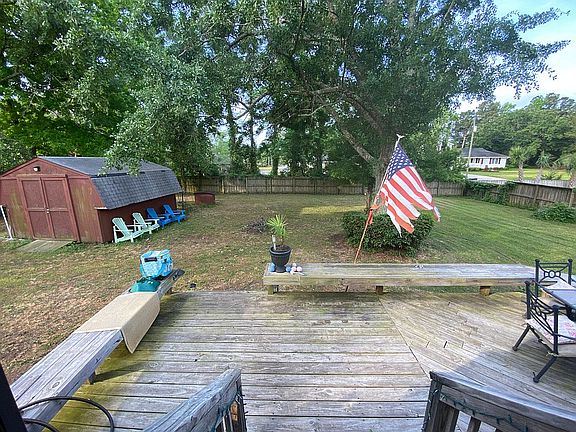Located in Tanglewood, this 3 bedroom, 2 bath home offers a spacious living room with vaulted ceiling, center fireplace, and hardwood floors which flow throughout dining room, kitchen, and foyer. Popular split floor plan offers additional privacy for family members and/or guests. Kitchen features a smooth-top range, built-in microwave, and french-door refrigerator. Master suite has an updated bathroom with tiled walk-in shower. Sunroom overlooks the spacious fenced backyard. Storage shed and a back gate, perfect for pulling in a boat or trailer. Single car attached garage, and side RV/boat parking. Conveniently located near the waterway and Trails End Park and Boat Ramp.