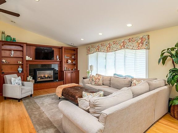 CENTER OF TOWN RANCH! Move right in to this perfect ranch, located right near EVERYTHING! Open living at its finest. Large Living room has hardwood floors, custom built ins, gas fireplace and vaulted ceilings. Renovated kitchen boasts hardwood floors, tiled backsplash, stainless steel appliances, custom cabinetry and a wine fridge. Carpeted cozy family room with large picture window for natural light. Separate sleeping area boasts 3 nice size bedrooms with hardwood floors. Over 1,100 square feet of finished living space in the basement with recessed lighting and a huge carpeted bonus room. Plenty of room for storage and a cedar closet. Enjoy outdoor living in the private backyard on the stamped concrete patio. Professionally landscaped - custom window treatments on every window - freshly painted. Nothing to do here, but move right in.