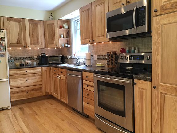 3 bedroom 2 full bath located in Waterbury Center in a nice, quiet, cul-de-sac neighborhood. New kitchen with Hickory cabinets, maple hardwood flooring, tile backsplash and new stainless appliances. 2 1/2 acres, paved driveway. Lower level has 2 bedrooms a full bathroom, a nice laundry area with a large storage room. Detached 2 car garage with new insulation and plywood on the walls and ceiling and a Vermont castings wood stove.