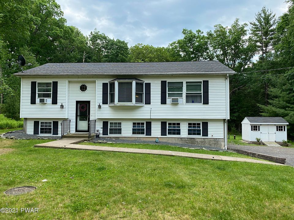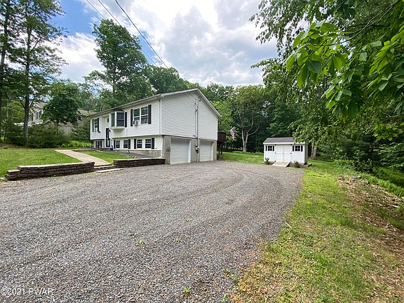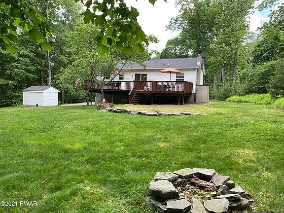 Beautifully maintained bi-level home located in a desirable lake community, close to the town of Milford and Route 84. Home has three bedrooms and two baths. Privately set away from road with large front and back yards on an acre of property. Dining room sliders lead to a spectacular deck sprawling the back side of the home: perfect for entertaining friends and family! Home features hardwood floors in the kitchen, dining area and living room. Updated kitchen has stainless steel appliances. Large master bedroom with two closets and an updated private bath. Spacious family room with an attractive fireplace and laundry room on lower level. Long, gravel driveway with plenty of parking space leads to a wide two-car garage and shed. Located in community with amenities such as private pool/beach.