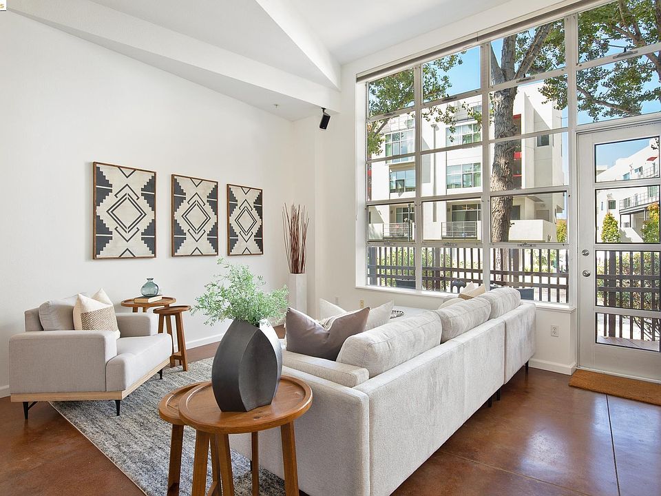 Fabulous modern Oliver Loft, in vibrant Emeryville near all the high-tech firms and all the good eats, just half a block away. Unique spacious ground-floor unit with outdoor patio and direct access to the wonderful Emeryville pedestrian greenway trails. Ultra-high ceilings and sexy stained concrete floor provide the iconic loft living and the spacious bedroom is warm and cozy with plenty of closet and storage spaces. The modern cool office is also spacious and can easily function as a guestroom. The spacious great room offers high volume, tall ceilings, sunny floor-to-ceiling windows, and a sleek gourmet kitchen. The luxurious custom bathroom was completely remodeled recently. One deeded covered parking is conveniently located at an easily accessible spot.
