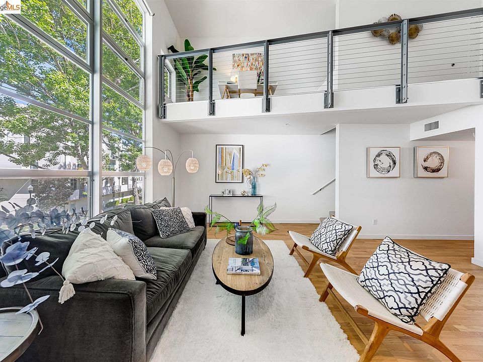 Discover your own urban oasis in this quiet and comfortable loft that lives like a 2 bedroom. A peaceful scene lies just outside the 12ft wall of windows facing westward to the tree-lined Emeryville Greenway (walking/bike path). Cascading natural light invites you into the open living space with soaring ceilings and an adjoining updated kitchen. The spacious bonus room on the main floor compliments this bright and airy vibe with its well-designed skylight, making it perfect for an office/guest room combo. Upstairs is the large loft primary with a full bath, laundry, walk-in closet, and a sizable cat-walk fitting of a desk or yoga space where you can continue to enjoy views of the tree canopy outside. Unit #205 comes with upgraded smart-home features, garage parking, bike room, conference room, and shared roof-deck. Commuter-friendly minutes to freeway access, and the free Emery-Go-Round to BART and Amtrak. Close to Bay St. shops, local eateries, Berkeley Bowl. The Oliver Lofts are one of the most desirable complexes on the remarkably convenient Emeryville/Oakland border. Come and see for yourself!