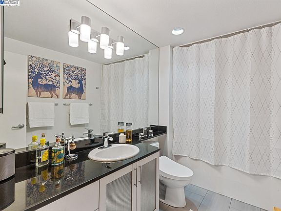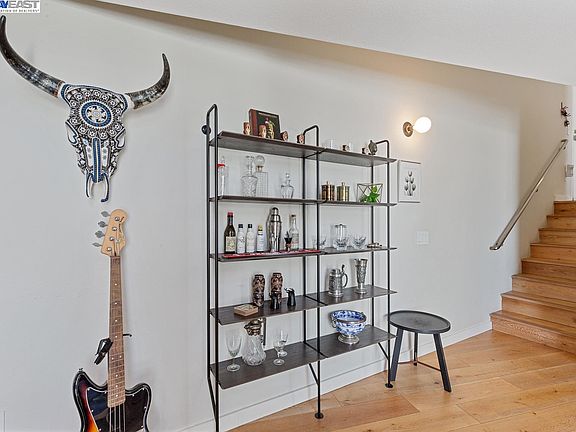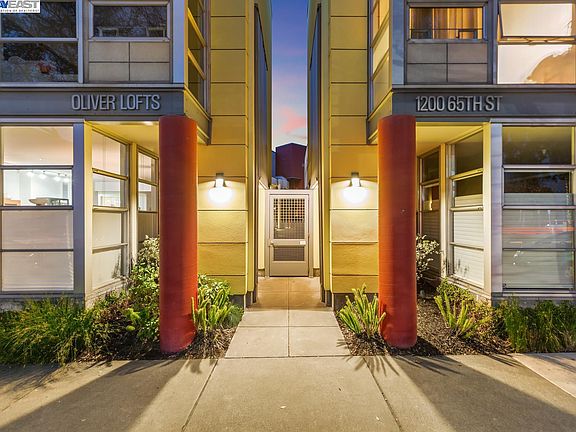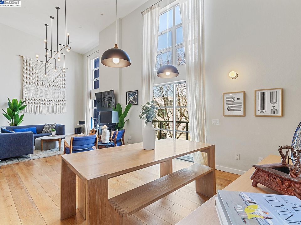 The architecturally unique Oliver Lofts are at the epicenter of Emeryville's creative/tech hub. Suite 306 at 1200 65th Street is a spacious 2BD/1.5 bath, top floor, 1429 sq ft corner loft. Natural light pours through the floor-to-ceiling windows of the living room, dining area, and both bedrooms. Steps from the entry is an open-floor plan living and dining space with chic, black brick fireplace, hardwood floors, and contemporary industrial-style lighting hung from the double height ceilings. A sleek, modern kitchen flows directly to the dining area where you can dine while looking out onto the patio. On this floor you will also find a sunny bedroom, half bath, hall closets, under-stair storage, and washer/dryer. The upper level features a vast primary bedroom including hardwood floors and a closet with custom storage system. The full bath contains a shower-over-tub, generous counter space and storage. Amenities include: secure bike storage room and garage with 2 spaces for this suite. A freight elevator takes you directly to your floor. Situated near Pixar, local eateries, Bay Street mall, and the water front walking paths. Commuter-friendly with easy access to every major freeway, bus lines, and the free Emery-Go-Round.
