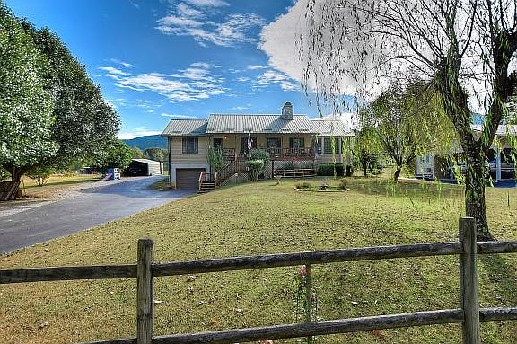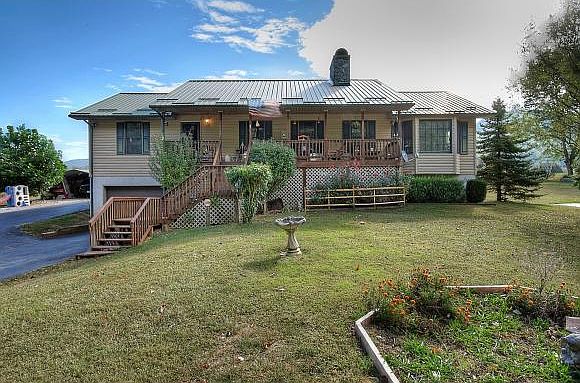 Beautiful one level home on 2 level lots with so much to offer! Incredible great room with soaring wood ceilings and massive stone fireplace. Split bedroom plan; 3 rooms in basement. Covered front and back porches. Great garden spaces.