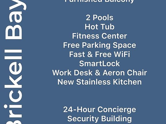 The property is full-amenity, including 24-hour concierge, valet and free parking, 2 pools, fully equipped gym, and Smartlock entry. Free parking space and full parking valet. Security building. Very quiet floor. Fast Wi-Fi. Utilities all paid. Perfect live/work/play environment.