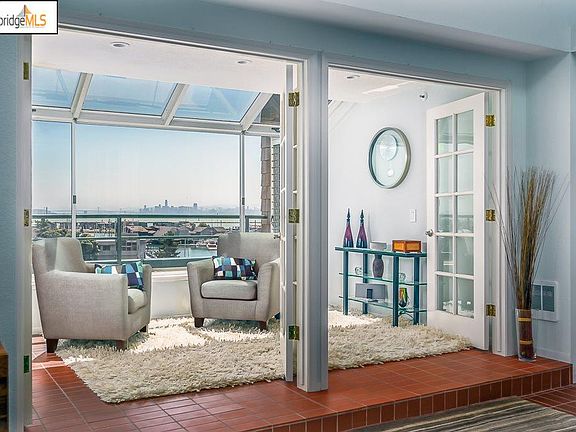 Experience magnificent, unobstructed views from this LARGE Penthouse II. Enjoy the quiet and privacy only available from a top floor condo! 3 skylights, 2 sun tunnels, clerestory windows, and cathedral ceilings bathe this airy home in light. Entertain guests or have a peaceful day sunning on your LARGE, private deck. If the weather is less than perfect, spend time in the spacious solarium. Both provide amazing views of SF, Angel Island, Marin, and the Bay. Watch the Richmond Ferry as it makes its way to and from SF. If you're feeling more active, enjoy the resort-like facilities conveniently located just steps outside your door: year-round heated pool; gym; saunas; hot tub; tennis; clubhouse and community garden. With 2 bedrooms, 2 full baths, den, solarium, and an eat-in kitchen, this gracious home provides ample room for you and your guests. 2 parking spaces and 3 storage lockers, all located in the same building. Minutes to SF ferry, BART, 80/580.