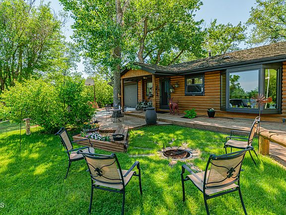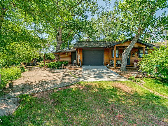 One-of-a-kind Log Home on a private park like setting on almost one acre! This beautifully well-kept and lovingly maintained home overlooks the Heart River Corridor. Zoned rural but is only minutes away from downtown businesses, schools, golfing, parks, and I-94. Floor to ceiling windows in living room and bay window in dining room allows for a lot of natural light. Vaulted ceiling and play area in the loft. The wood burning fireplace was constructed with local stone and adds an ambience that is reminiscent of days gone by. There is 2 bedrooms, full bath w/ double sinks and a half bath, reading/sitting room, a laundry/sun room on the main. Basement has a family room and 2 bedrooms. Garage has a single car door but opens into a large workshop/garage which is heated with a wood burning stove. Sprinklers in the front and back. New roof in 2022.