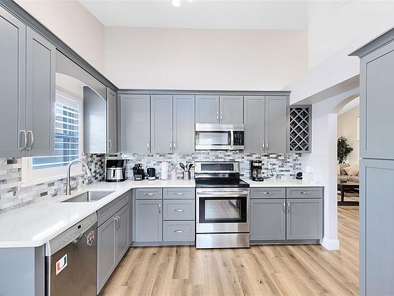 Modern gray shaker cabinetsModern ceiling fansTwo-car garageRenovated kitchenGranite countertopsIndoor laundry roomSpacious primary suite