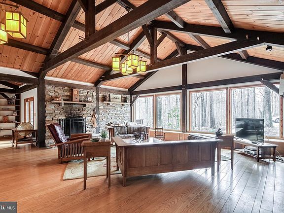 Frank Lloyd Wright once said ~No house should ever be on a hill or on anything. It should be of the hill. Belonging to it. Hill and house should live together each the happier for the other.~ On a hill at the end of a private driveway meandering through towering hardwoods, sits this stunning custom contemporary American Craftsman inspired home, reminiscent of a Pacific Northwest lodge, truly belonging to the land on which it was built. A new (2019) GAF three dimensional architectural shingled roof with 50 year warranty and freshly painted (2019) exterior wood siding and trim blend the manufactured and natural elements together in harmony with the surrounding 3.4 acres of woods.Custom French doors lead into a 3500+ square foot home where the design masterfully blurs the lines between indoors and out. Here again, manufactured and organic materials collide in a harmonious design inspired by the great architects Frank Lloyd Wright and John Storrs. Under vaulted ceilings supported by exposed, true post and beam construction, massive picture windows bring light softened by the mature trees in. Varying width hardwood floors, stacked stone hearth and feature wall, and a vast, warm, open living space create space for both entertaining and contemplative, quiet thought by the fire or built in book cases. Twin decks leading from the main living area create multiple opportunities for outdoor living space. Fresh neutral painted surfaces (2020) contrast the varying tones of the natural and stained wood finishes throughout.The expansive owner~s wing with elements of rustic, modern, and classic design has a spa-like bath, en suite laundry, and massive walk in closet; Sure to please the most discerning tastes. Across the home, the two bed rooms are both spacious and cozy. The corner bedroom~s whimsical loft will surely be the place to play hide and seek. Down the steps into the finished day lit basement is a luxuriously carpeted recreation room with walkout French doors to a third, l