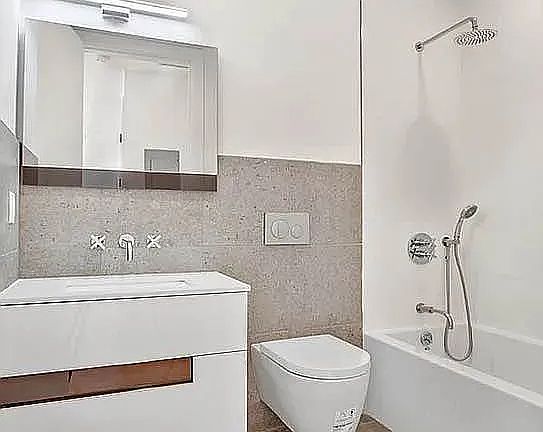 Spacious 1 bed bath 1has a sunny open concept kitchen with white stone countertops and backsplash, stylish custom cabinetry, built-in refrigerator, and sleek oven and cooktop. All units featured custom closets, washer/dryer, built-in speaker system, and smart home control. A large modern bathroom featuring gorgeous wood finishes, custom Italian vanity, and a deep soaking tub. Each unit has a virtual intercom/doorman and a sunny patio!