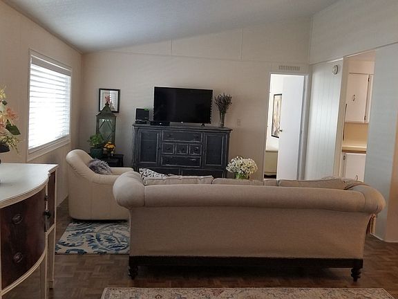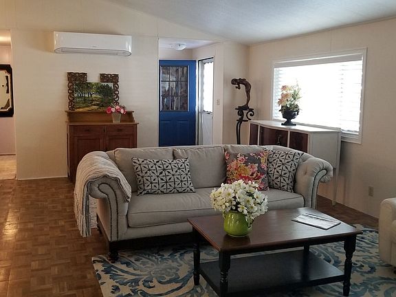 Lovely home with fenced yard and beautiful landscaping. Covered deck with new awning to enjoy the outdoors. New windows and blinds, new water heater, freshly painted inside. New thermostat & dishwasher. Kitchen appliances included. Located at back of park w/view of trees & near 2 mile walking/biking trail along creek. Park has pool, club house w/library, kitchen, billiard room. Current monthly dues of $478 include water, sewer & trash pick-up. Some home furnishings available for sale.