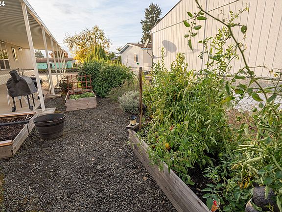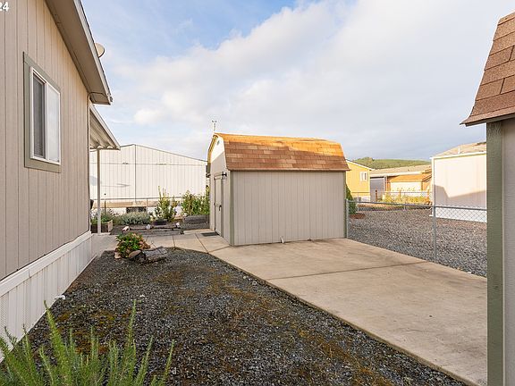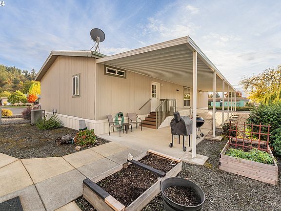 Welcome to this newer 3 bedroom 2 bath home in Pineview Mobile Home Estates in Sutherlin. The home is situated on a large corner lot with an extra deep carport for parking and covered patio area in the fenced back yard. There is a work shop for tinkering and a garden shed for storage. Raised beds allow you to cultivate your own food or flowers for your enjoyment. Relax on the large covered front porch with a view of the landscaped front yard complete with a drip irrigation. Step inside to take in this generously sized split floor plan complete with a family room , living room, laundry with butlers pantry, utility room/office, and primary suite. Two additional bedrooms allow space for guest, family or a hobby room. In the kitchen you will find granite counter tops, a pantry and much more!