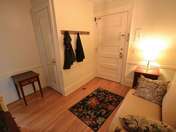 This is a bright sunny 2nd floor unit with high ceilings, lots of windows, hardwood floors throughout and 2 baths. Flexible floor space can accommodate either 1 bedroom with a study, 2 bedrooms with Master Suite, 1 bedroom and a dining room or a large expansive single living room/dinning room.. The entrance to this unit has a foyer that leads into an expansive living space with book cases across the full living space. French doors connect the two main rooms. The bedroom suite has a full tiled bath with a separate attached solarium ( bright room with lots of windows looking out over the tree tops.) The unit is priced at $1450 including heat. Tenant pays electric. It has access to an onsite laundry, 1 outside parking space and 1 garage space for an additional fee. One year lease, Negotiable