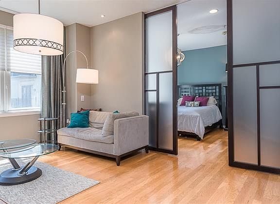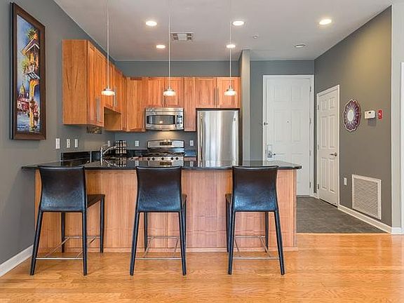 Impressive well lit "loft" home fts. maple cabinets,massive granite breakfast bar,SS apps,recessed lighting,2 California closets,CAC & WD. Enter the large master suite thru gorgeous modern pocket sliding doors, complete w/spacious walkin closet,BA w/double vanity & standup shower. 2nd BR complete w/large soaking tub. Unit currently being used as oversized 1BR. This elevator bldg w/fitness center,beautifully updated modern residence lounge,common courtyard & deeded garage parking complete this stunning unit.