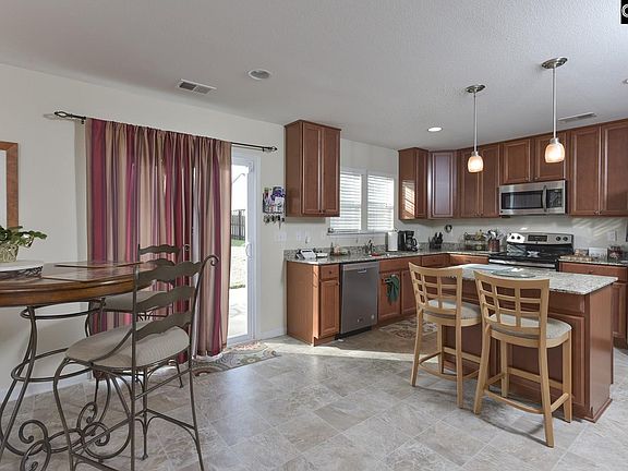 • RoomKitchenFeatures: Granite Counters, Kitchen Island, Pantry, Eat-in Kitchen, Floors-Vinyl, Cabinets-Stained