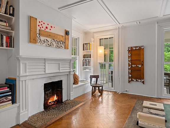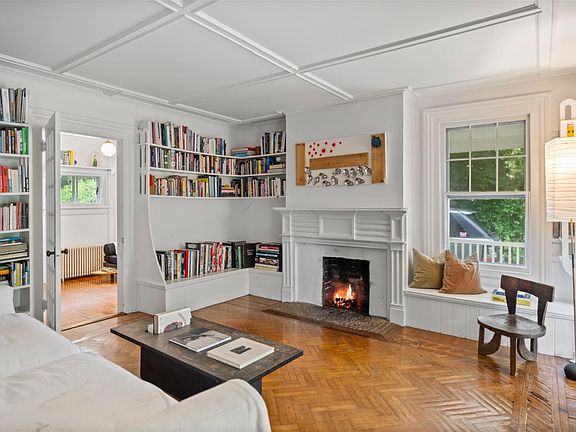 Inside, you'll find original plaster walls and crown moldings, intricate parquet floors, and finely crafted woodwork, cabinets, shelving, and staircases. The home is equipped with three functional fireplaces and a charming wood-burning stove, offering both warmth and ambiance. Two of the bedrooms feature luxurious Hastens king mattresses for an unparalleled sleeping experience. A contemporary kitchen adds modern convenience without compromising the home's historic charm.