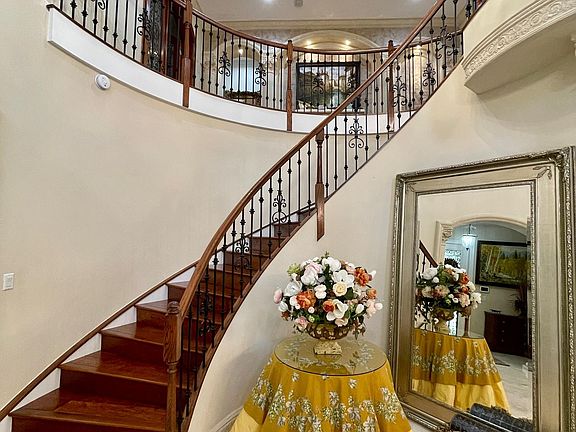 HOME: FULLY FURNISHED - An executive and luxurious home featuring high-end attributes like Venetian plaster walls, stone columns, crown molding, and a 20-foot stone gas fireplace. Polished natural stone floors beautifully enhance the wood floors. This home's layout includes a family room, kitchen, eat-in kitchen area, formal living and dining rooms, laundry, guest bath, and wine room on the first floor. The upper floor features a third living area, family room, TV area, and a luxurious office adorned with cherry cabinetry, baseboards, Swarovski glass, and an imported cherry door. The master suite offers a spacious bedroom with a sitting area, plantation shutters, a mini bar/coffee area or makeup station, his and hers sinks, a garden tub, a natural stone tile shower, and a large built-in closet behind the double entry door.