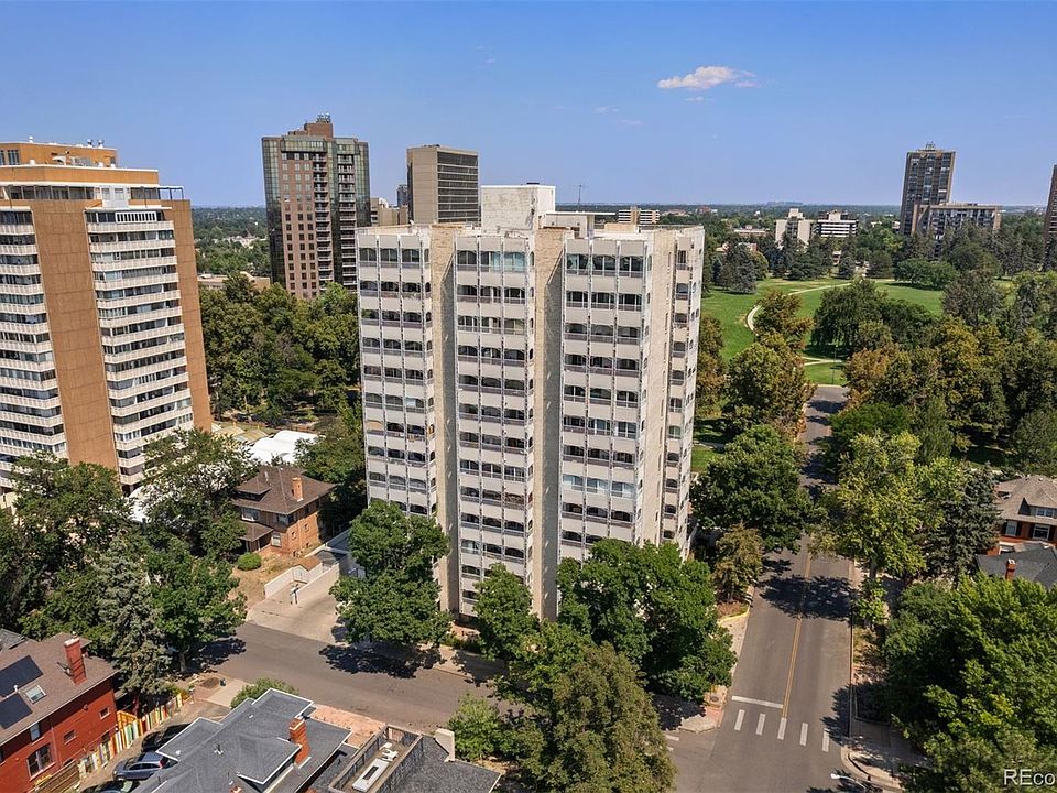 Experience the perfect blend of peaceful park-side living and vibrant city life in this spacious 2-bedroom, 2-bath corner condo, ideally located next to Denver’s iconic Cheesman Park. An open floor plan filled with natural light flows effortlessly to an expansive enclosed balcony, now a year-round sunroom with functional windows and screens, perfect for enjoying peekaboo downtown views as the canopy of mature trees begins to thin in the fall. The kitchen features crisp white cabinetry, a large pantry, extra storage under the peninsula counter, and room for seating. A dedicated dining area and adjacent living room, seamlessly connected to the kitchen and outdoor space, make entertaining a breeze. The primary suite offers its own private balcony drenched in southern sun, two closets and a en-suite bathroom. The second bedroom provides generous closet space, charming arched wood shutters, and flexibility for family, guests or a home office. Amenities in this secure building elevate everyday living with an enclosed heated pool for year-round swims, an expansive terrace overlooking the park, a fitness center, steam room, reservable guest suite, and a welcoming gathering room with billiards and a kitchenette for hosting friends. Additional conveniences include a deeded underground parking space and private storage unit. Your HOA covers nearly everything—water, heating, A/C, trash, recycling, snow removal, and building maintenance—making lock-and-leave living truly effortless. Step outside to the park or stroll to Capitol Hill, Uptown, Congress Park, and City Park. Within minutes, you can be at Cherry Creek, the Botanic Gardens, Denver Zoo, or the Museum of Nature & Science. This home is a must-see.