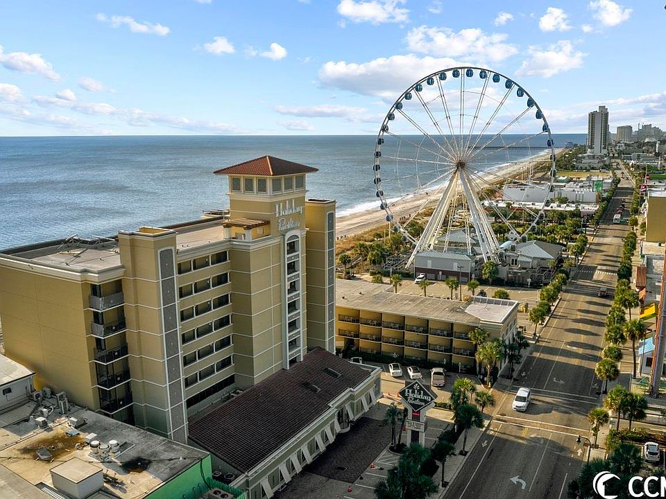 Welcome to this stunning DIRECT ocean front END UNIT one bedroom condo in the heart of Myrtle Beach!  Not many condos can say that they not only have amazing views of the ocean but also the pier and SkyWheel right from your balcony!  Located along the boardwalk and with attractions, restaurants and entertainment all surrounding the building, this is a convenient and fun vacation spot!  The condo sleeps 6 with two double beds in the bedroom and a Murphy bed in the great room.  It comes fully furnished and ready for you to simply pack your bags and start your vacation!  Holiday Inn Pavilion offers indoor and outdoor pools, hot tub, a lazy river, kiddie pool, fitness room, tiki bar and coffee cafe!  Be sure to check out the immersive 3D tour and schedule a showing today as this unique condo won’t be on the market long!