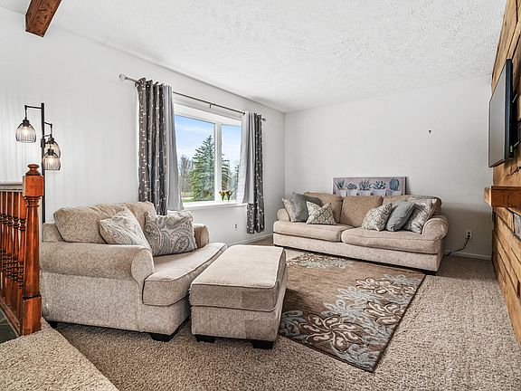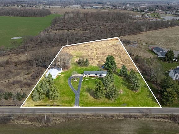 Amazing, large ranch home on 6.2 acres with 2 pole barns and geothermal HVAC! Set back from the roadway, with a circular driveway, this home offers space, both inside and out, all less than 10 minutes from the charming town of Charlotte. Guests are greeted by many custom touches, including a vaulted ceiling, sunken living room, and a large kitchen, drenched in natural light, with brick arch over the cooktop and built-in wall oven. The kitchen offers direct access the oversized 2 car garage, a large deck and a half bath. The 1737 sqft main level includes a large primary suite and ensuite with a soaking tub, walk-in shower, another laundry, 2 more bedrooms, another full bath and plenty of storage. The walkout lower level offers a spacious family room with sliding door and large windows overlooking a backyard patio, a wood burning fireplace, hobby room plumbed for yet another bathroom, and utility room with large workout area. The Culligan water treatment system stays. Anderson Windows throughout. Both pole barns are connected by a wide hallway and have electric with concrete floors. The 48x32 pole barn also has water and is perfect for storing a large RV. The second pole barn is 40x24.